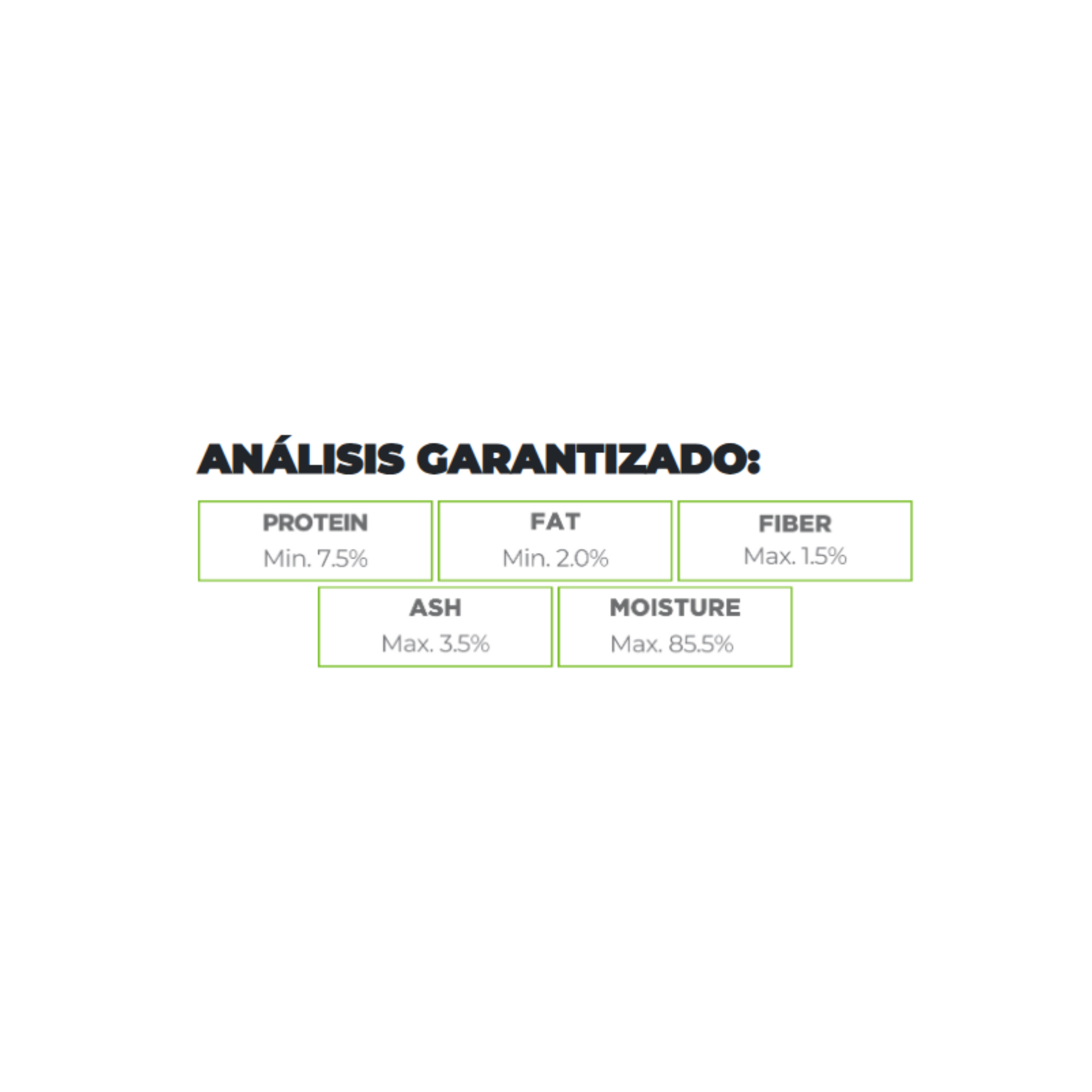 Subproductos cárnicos y porcinos (hígado, pulmón, bazo) y/o aves de corral (despojos) y/o pollo (despojos, hígado, corazón), agua suficiente para la transformación, hortalizas (zanahoria y guisantes), aditivos técnicos (goma xantana, goma garrofín, carragenina, goma guar), agentes palatantes (glicina), conservantes (nitrito de sodio), vehículos (pulpa de remolacha, mezcla natural de esteatita y clorito, ácido silícico, sepiolita), minerales (carbonato cálcico), azúcares (dextrosa), aditivos nutricionales (taurina, vitamina E, sulfato de zinc monohidratado, vitamina B1, biotina, sulfato de manganeso monohidratado, sulfato de cobre pentahidratado, yodato de calcio anhidro).