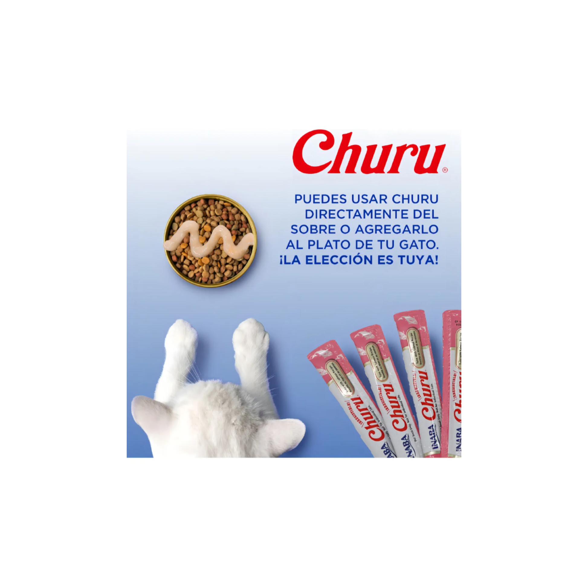 Churu® es un puré líquido muy sabroso, cremoso, bajo en calorias y totalmente natural que se utiliza para motivar el apetito, mejorar la relación de los propietarios con sus gatos, generar un mejor manejo en situaciones de stress y apoyar la hidratación.