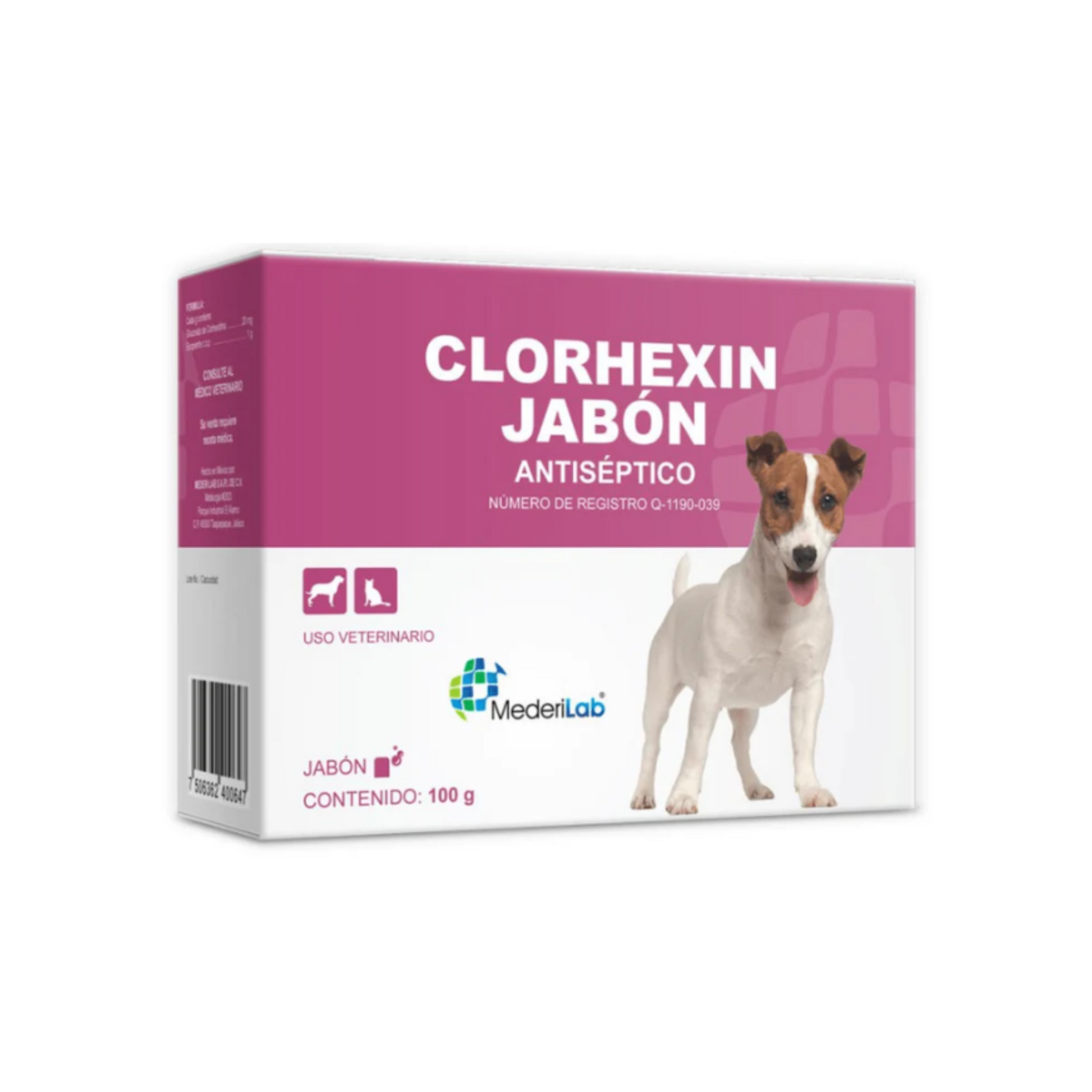 Clorhexin Jabón Antiséptico 100 g de MederiLab es un jabón dermatológico de uso veterinario formulado con clorhexidina al 2%, un antiséptico de amplio espectro que combate eficazmente bacterias, hongos y levaduras presentes en la piel de perros y gatos.