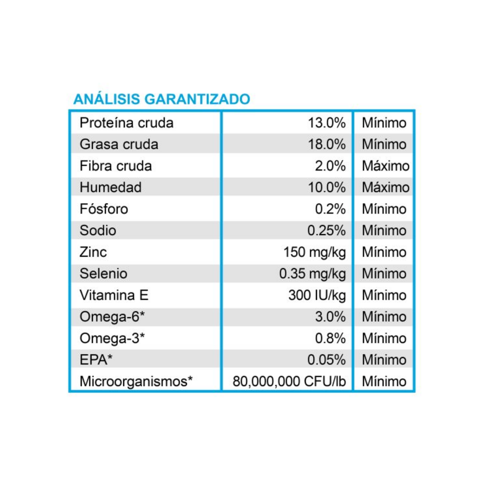 Arroz integral, grasa de pollo (conservado con tocoferoles mixtos), producto de huevo, proteína de papa, puré de jitomate, linaza, sabor natural, aceite de pescado menhaden (conservado con tocoferoles mixtos), carbonato de calcio, citrato de potasio, cloruro de colina, raíz de achicoria seca, taurina, producto de fermentación secado de Lactobacillus acidophilus, producto de fermentación de Bifidobacterium animalis seco, producto de fermentación secado de Lactobacillus reuteri, vitamina E, proteinato de hierro, proteinato de zinc, proteinato de cobre, sulfato ferroso, sulfato de zinc, sulfato de cobre, yoduro de potasio, mononitrato de tiamina (vitamina B1), proteinato de manganeso, óxido manganoso, ácido ascórbico, suplemento de vitamina A, biotina, niacina, pantotenato cálcico, manganeso sulfato, selenita sódica, clorhidrato de piridoxina (vitamina B6), vitamina B12, riboflavina (vitamina B2), vitamina D3, ácido fólico.