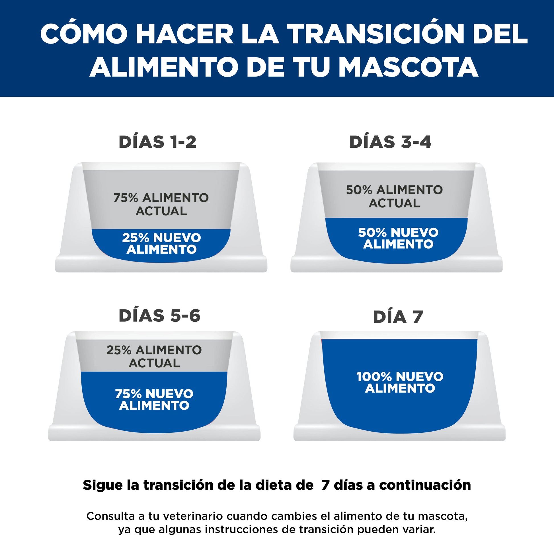 Realiza la transición gradual a nuevo alimento durante 7 días o más.