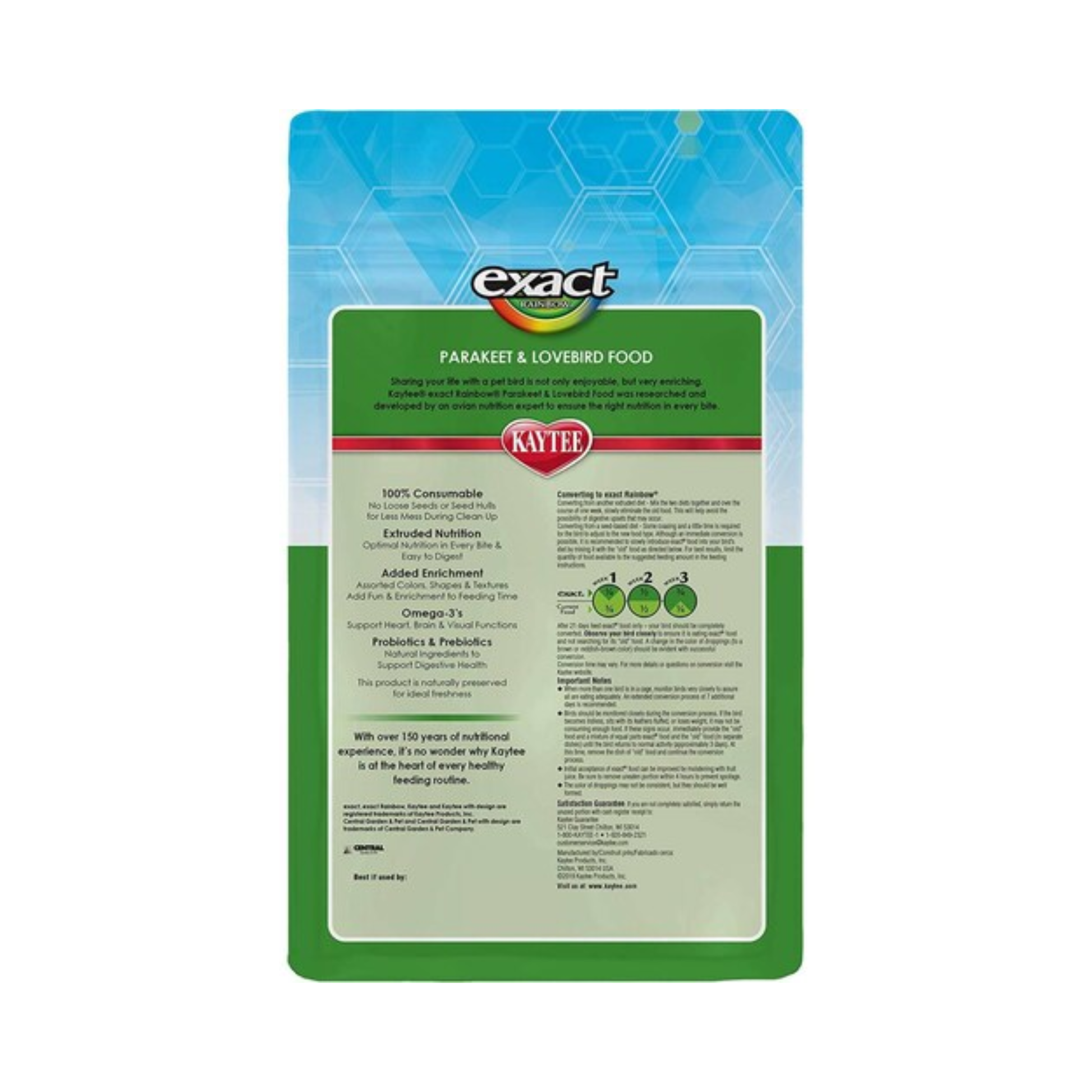 Exact Rainbow es una dieta completa y balanceada para periquitos australianos, agapornis, loros quaker y pequeños loros conuros. Cada pepita contiene “nutrición exacta”, asegurando que tu ave reciba los nutrientes necesarios para un plumaje saludable, colores más brillantes y excelente bienestar.