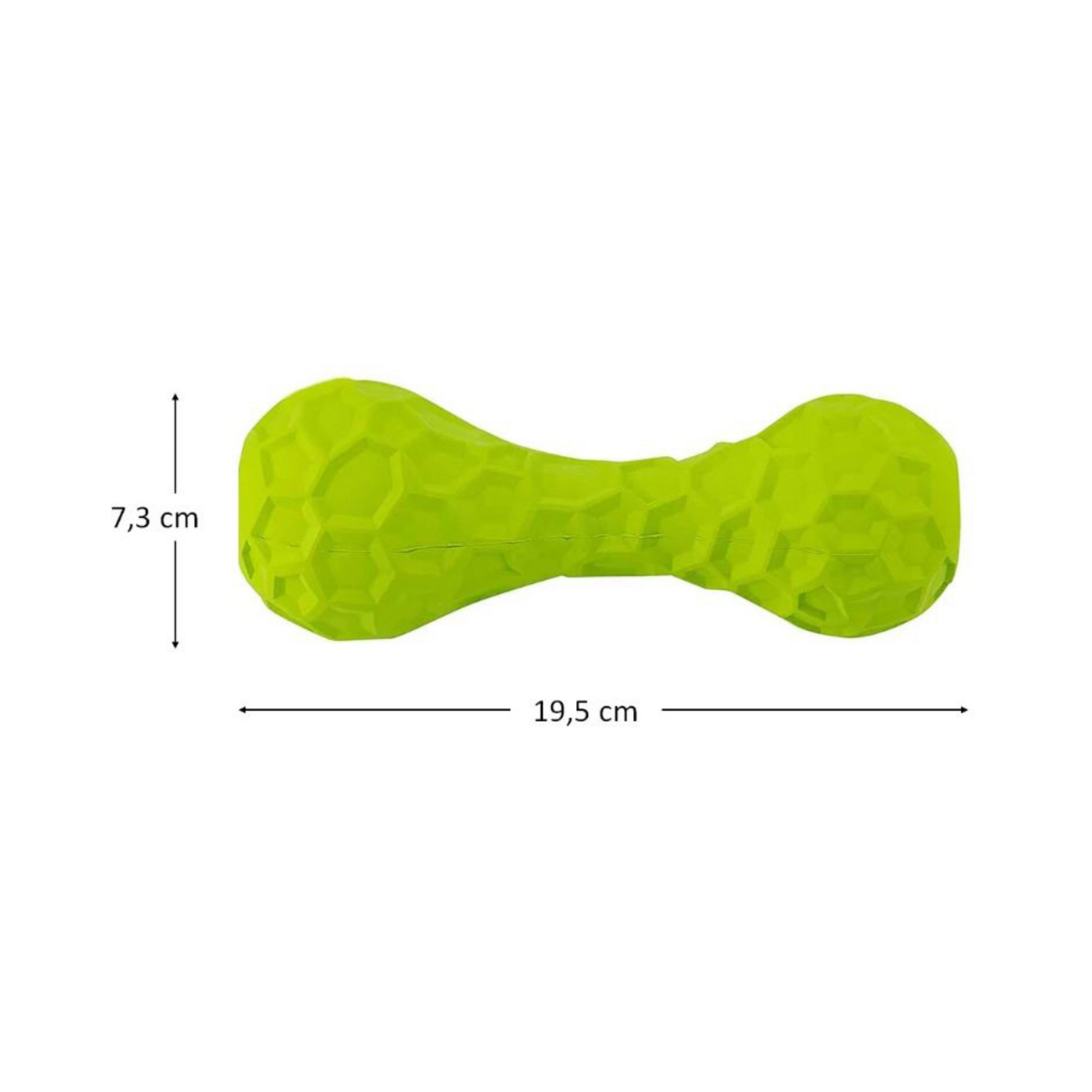 Su diseño en forma de pesa facilita el agarre y transporte por parte del perro, mientras que el sonido incorporado estimula su curiosidad y motiva el juego. El color verde brillante la hace fácil de localizar, incluso en exteriores.