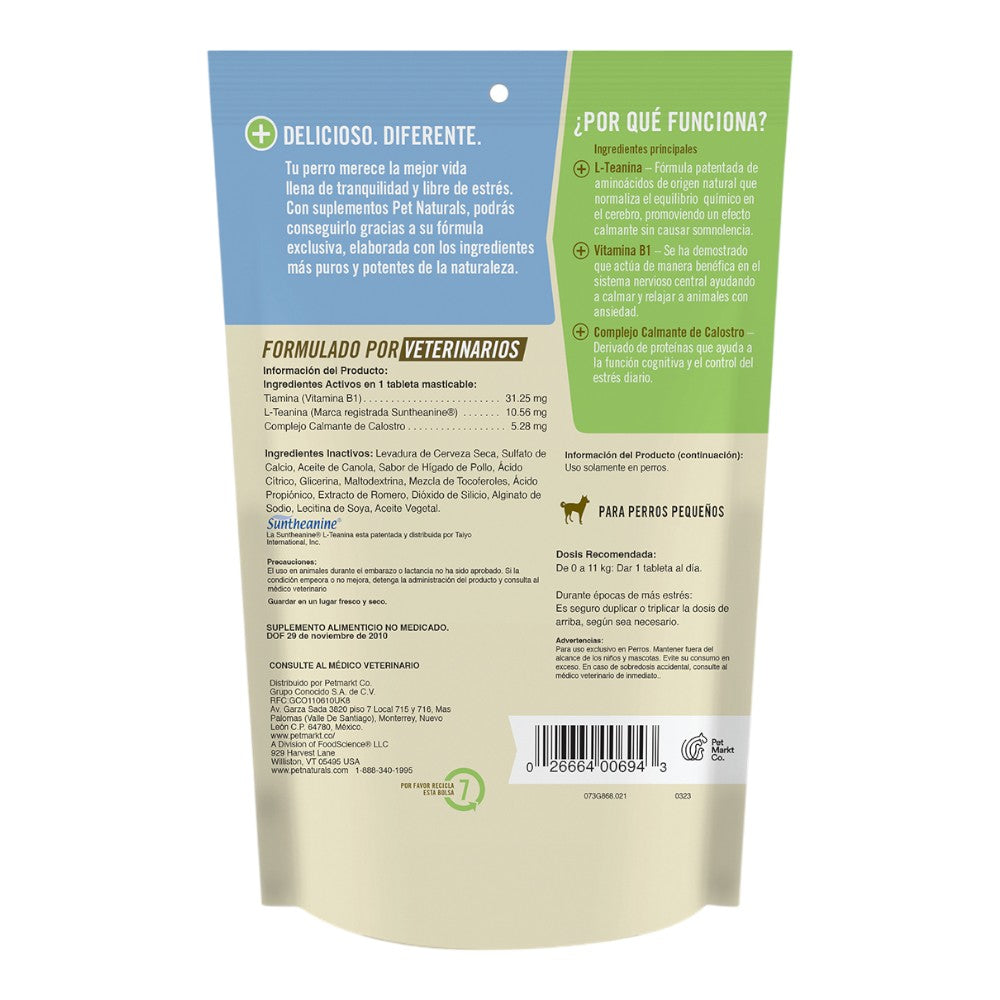 Estas tabletas para perros con sabor a premio están hechas con Tiamina (vitamina B1), conocida por su capacidad para reducir los síntomas de estrés, mientras que la L-Theanina, presente en el té verde, se ha reconocido por aliviar la ansiedad y fomentar la relajación. Además, estas tabletas contienen un Complejo Calmante de Calostro, que aporta un soporte adicional para calmar a tu mascota. Los calmantes de Pet Naturals ofrecen una forma segura y natural de calmar a tu perro, reduciendo los niveles elevados de estrés sin el riesgo de causar adicción o sobredosis. Deja que tu fiel compañero disfrute de la tranquilidad y bienestar que merece de manera natural.