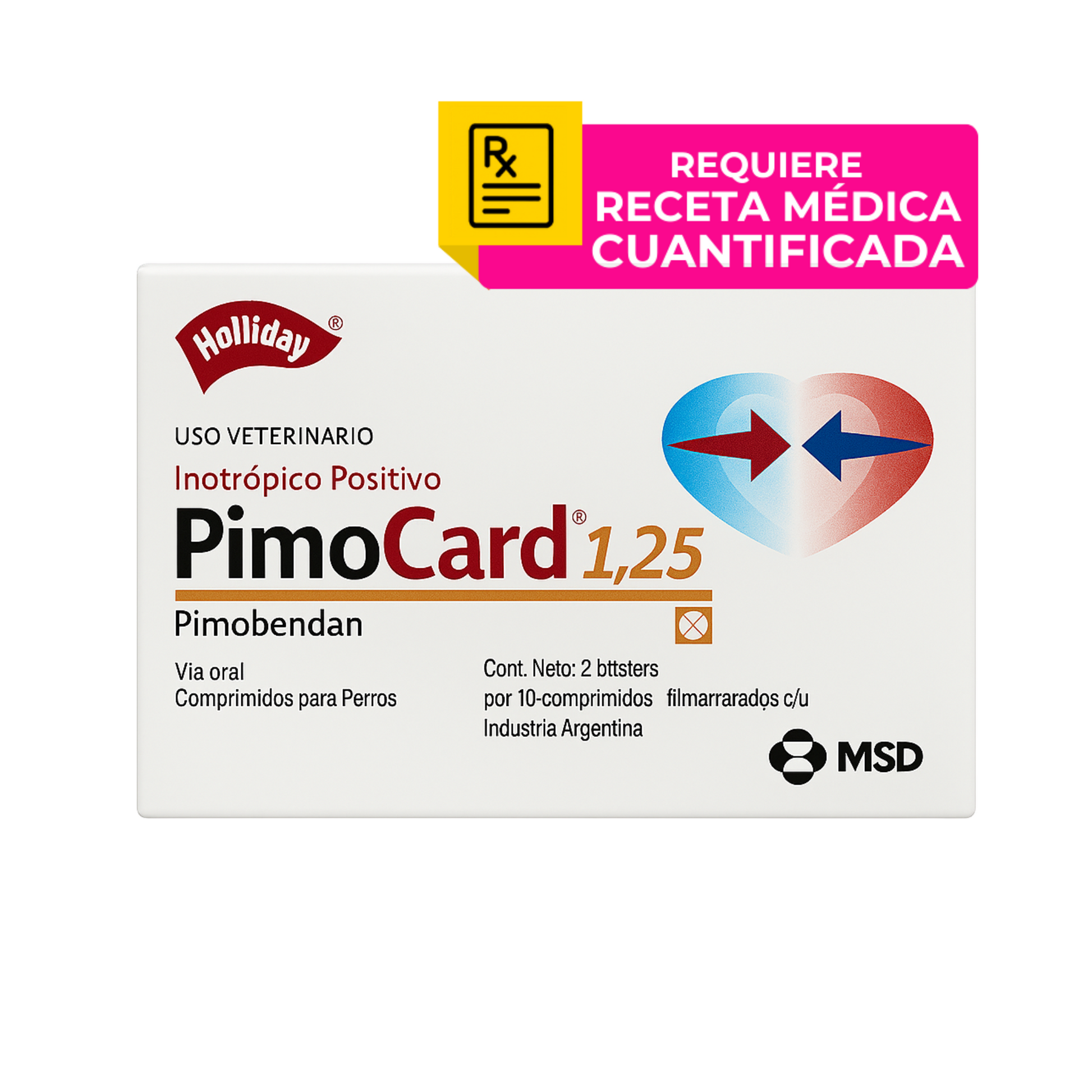 PimoCard 1.25 mg de Holliday es un medicamento veterinario a base de pimobendan, un inodilatador de acción combinada que mejora la contractilidad cardíaca y ejerce un efecto vasodilatador en perros con insuficiencia cardiaca congestiva (ICC).