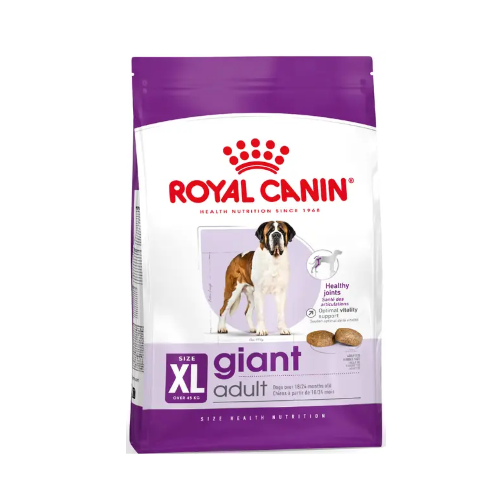 Este alimento seco de Royal Canin es para perros adultos de raza gigante de más de 45 kg de peso y más de 18/24 meses de edad. El alimento para perros Royal Canin para perros adultos gigantes contiene glucosamina, sulfato de condroitina y ácidos grasos omega 3, particularmente EPA y DHA para proteger y nutrir las articulaciones y también ayudar a combatir los mecanismos inflamatorios comunes en razas con grandes pesos.