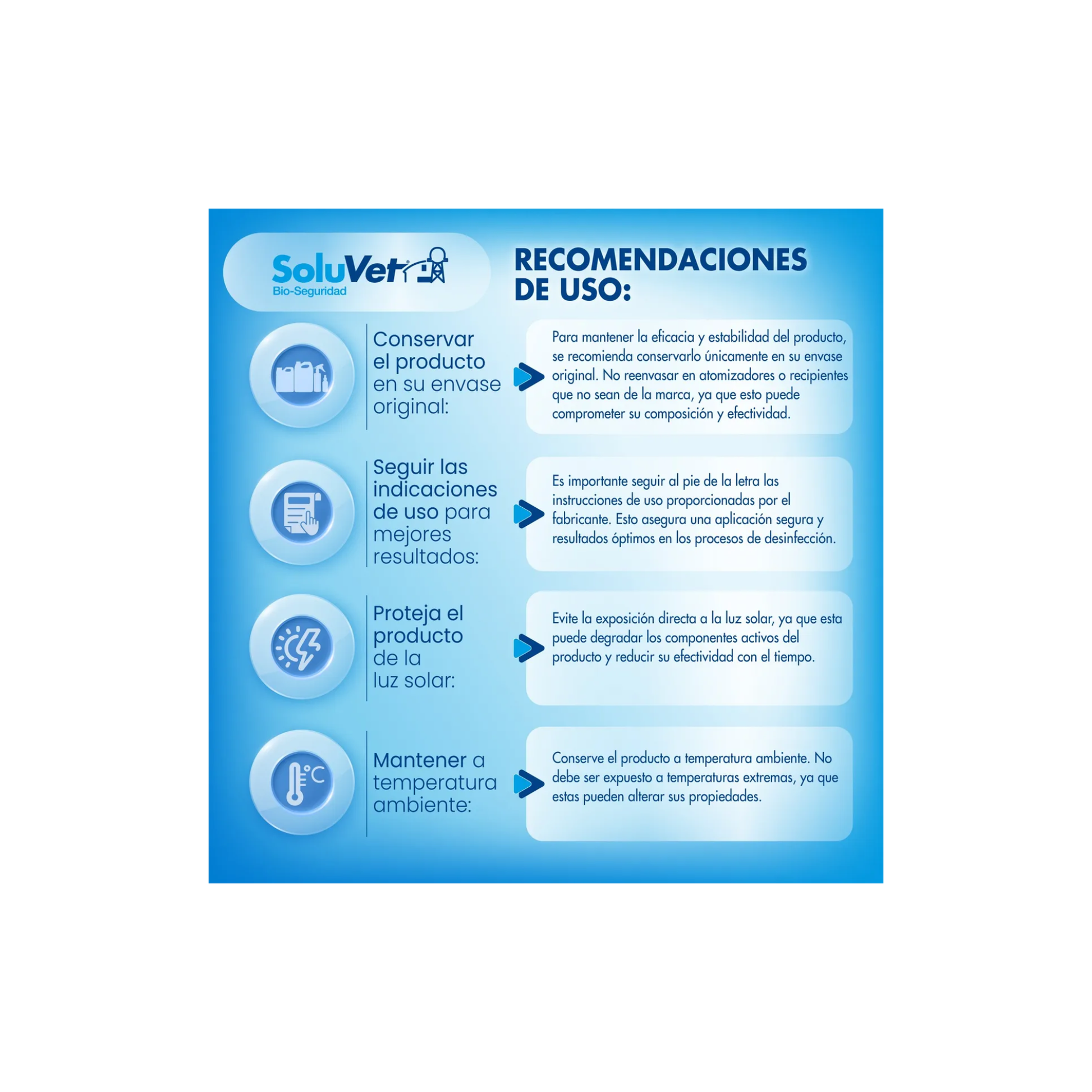 SoluVet Bioseguridad es un desinfectante con la capacidad de eliminar bacterias, virus y hongos a partir de los 30 segundos, presentes en las superficies de cualquier instalación veterinaria y áreas de contacto con animales. Es inocuo, por lo que no provoca efectos secundarios pudiendo ser utilizado en presencia de animales. Para el usuario
