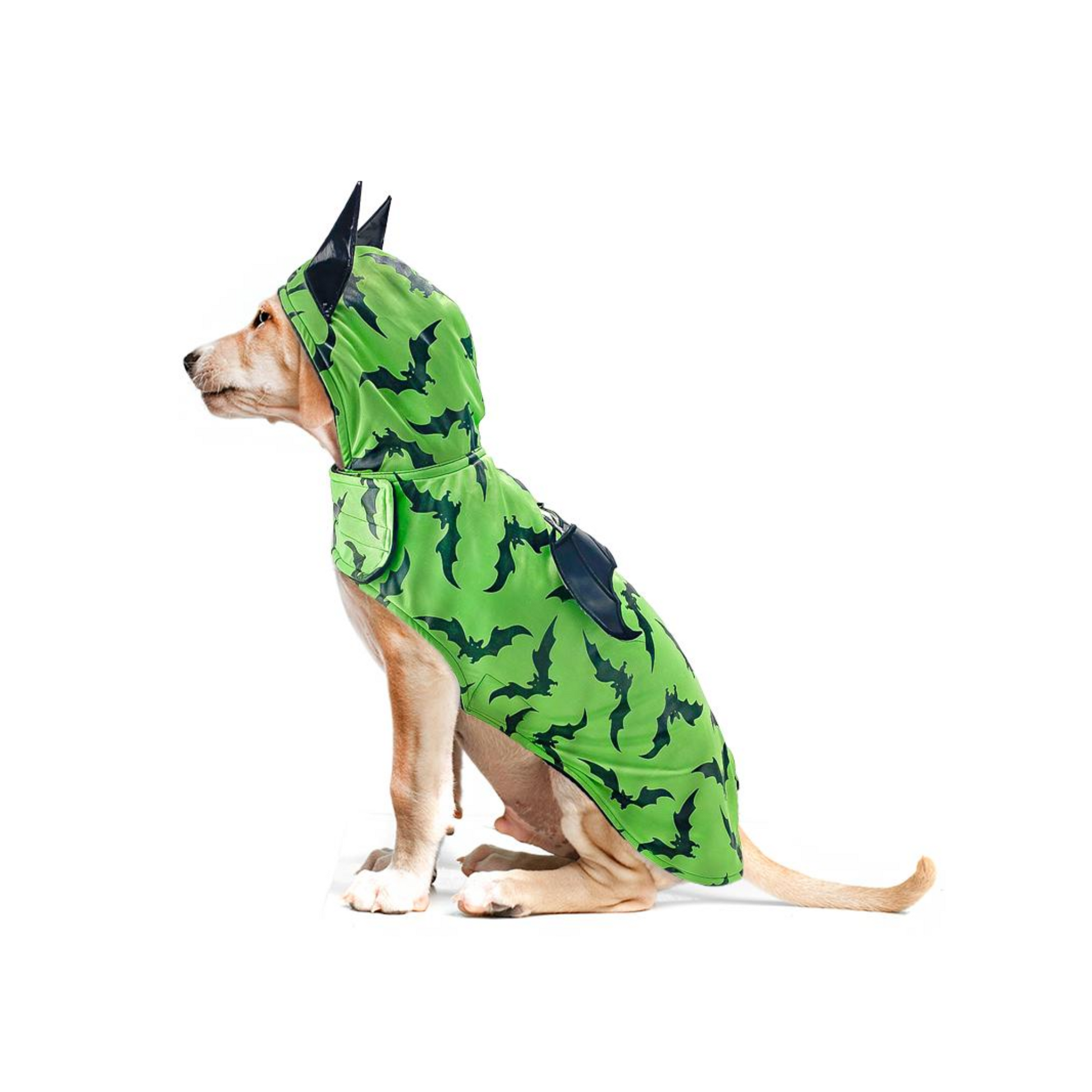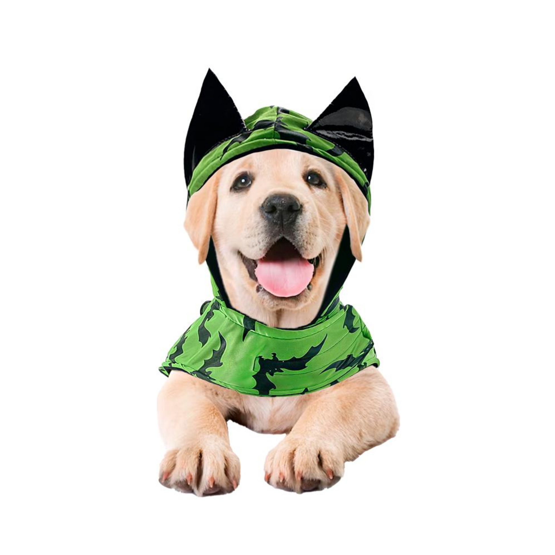 Su diseño presenta un color verde vibrante decorado con estampados de murciélagos que aportan un toque divertido y misterioso. Fácil de colocar y con un ajuste seguro, esta capa es ideal para sesiones de fotos, fiestas y paseos, asegurando que tu mascota destaque con estilo y personalidad.